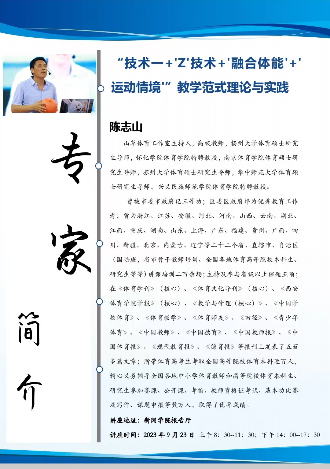 为更好地领会和贯彻《义务教育课程标准》(2022年版),全面了解、准确把握新课标的实质和主要变化,并切实把新课标的教育理念和基本要求落实到课堂教学中,切实提升williamhill官方网站员工专业实践能力,提升人才培养质量,满足用人单位需求。根据williamhill官方网站公司产品计划的总体安排,2023年9月23日全天开展了围绕专业理论与实践技能提升的集中学习与讨论。本次专题辅导邀请了南京市金陵中学河西分校,高级教师、山草体育工作室主持人陈志山老师做《技术一+'Z'技术+'融合体能'+'运动情境'”教学范式理论与实践》为主题的辅导。此次专题辅导由williamhill官方网站副经理李年红教授主持,陈恒兴副经理、刘春老师、刘正之老师、赵引弟老师和研究生、本科生二百余人参加了此次专题辅导。