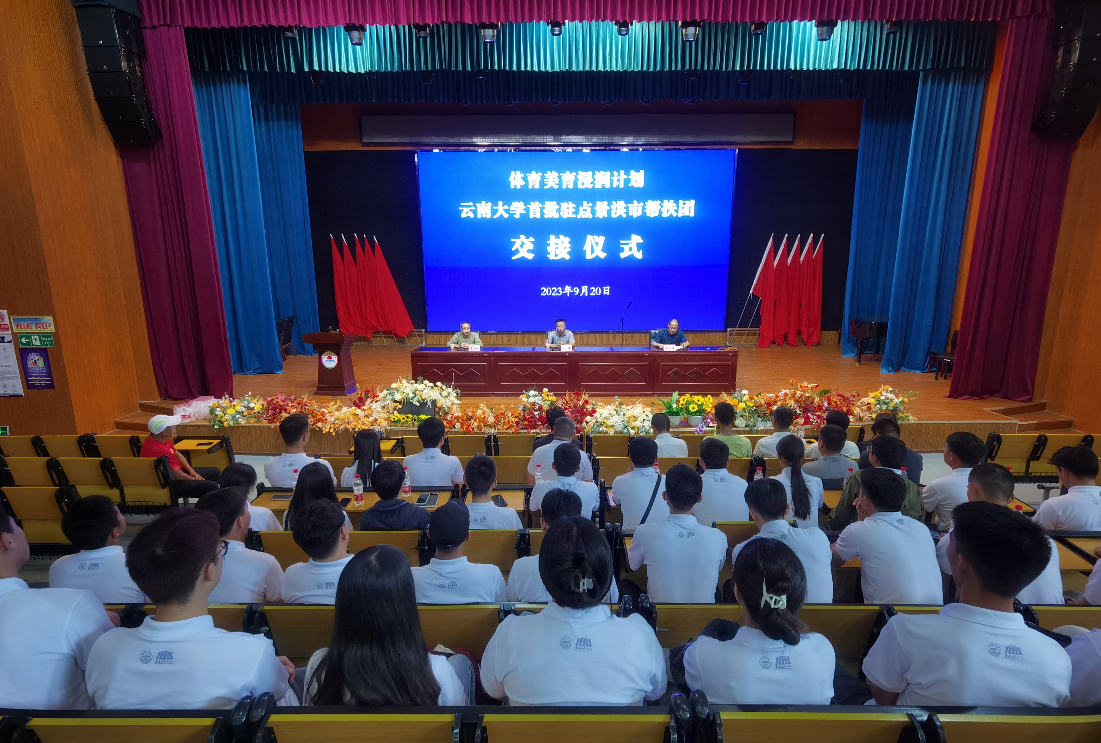 2023年9月20日,williamhill官方网站首批赴景洪市开展体育美育浸润行动计划驻点帮扶师生团出征仪式在呈贡校区举行。
