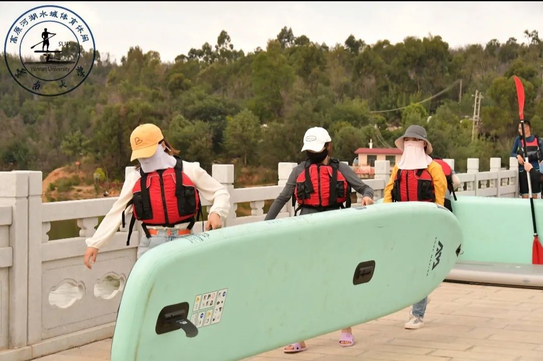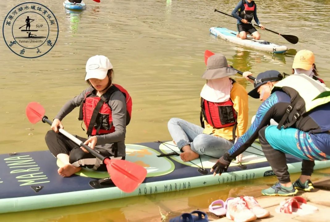 郑书记宣布活动开始,并和同学们一起下水体验桨板的乐趣。