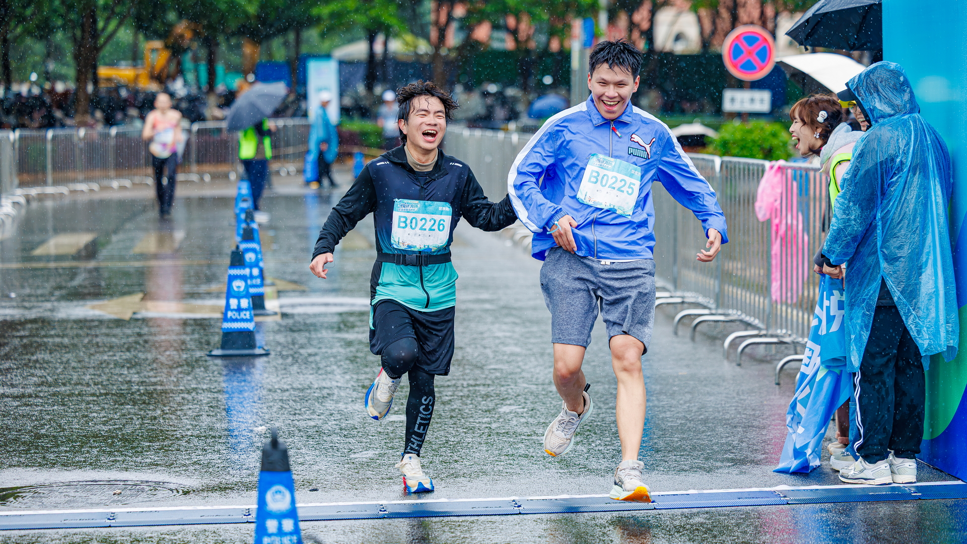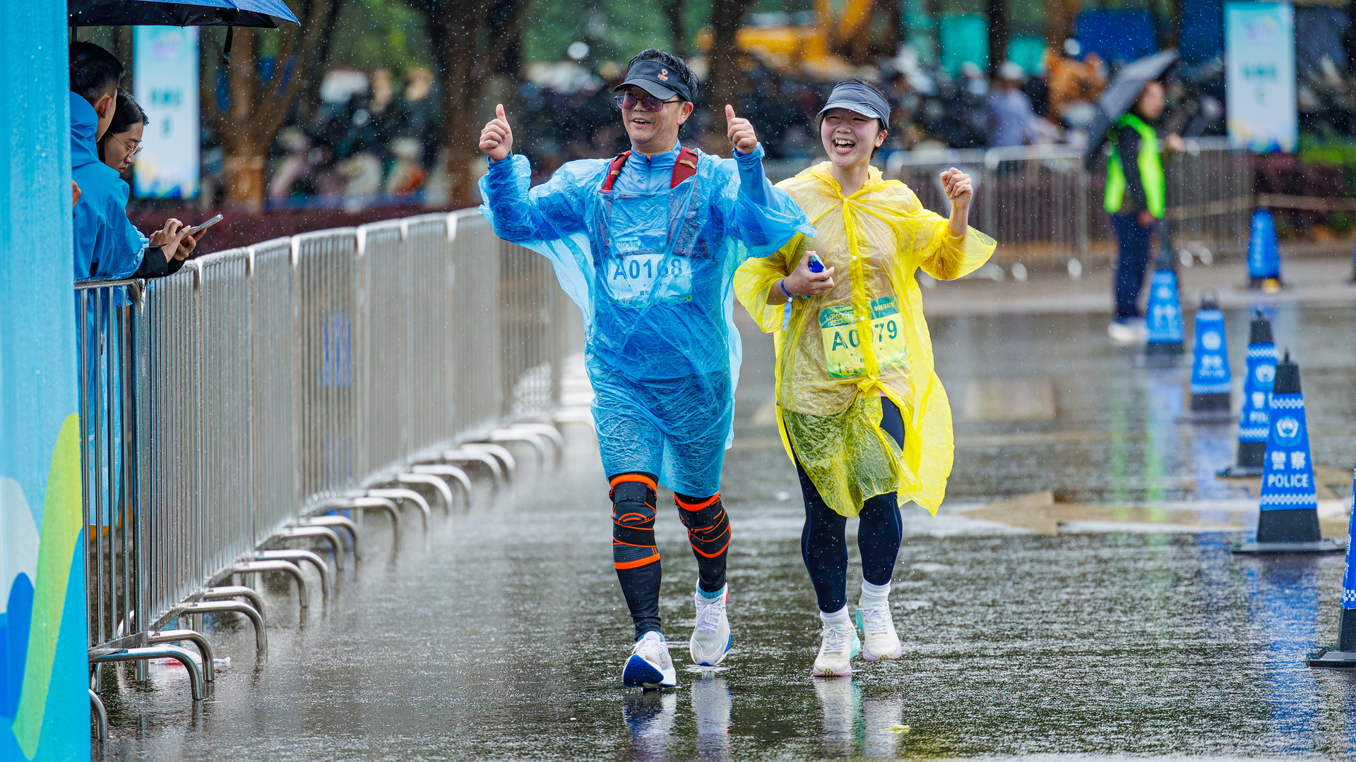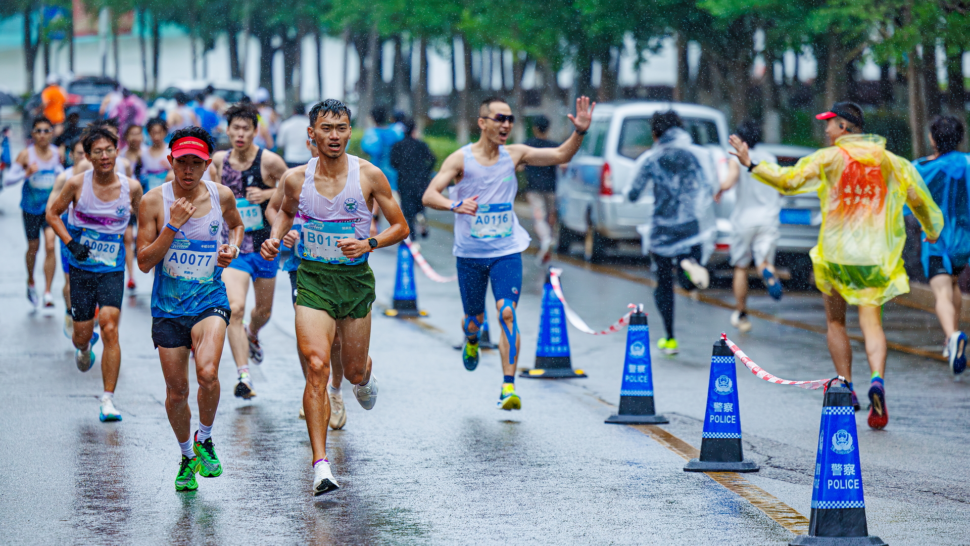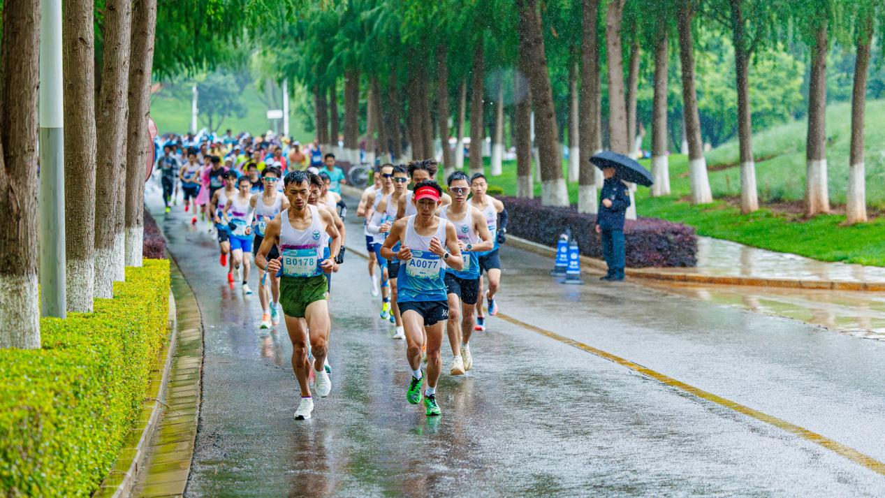 赛道上,选手们在雨幕中的身影充满青春活力与激情,每一步激起的水花,都绽放出顽强的意志和不屈不挠的精神。赛道外,热情的观众挥舞着绘有鼓励图案和话语的手幅加油助威。呐喊声和欢呼声此起彼伏,与选手们坚定有力的脚步声交织,共同谱写一曲动人的交响乐,展现了体育竞技的无限魅力。