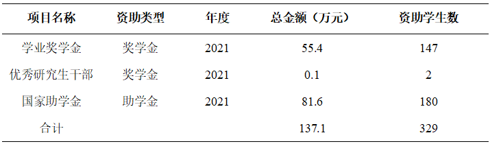 本学位授权点对于体育硕士专业学位研究生提供的奖助学金资助主要包括研究生国家奖学金、研究生学业奖学金、研究生优秀及单项奖学金和研究生国家助学金四大类,其中研究生学业奖学金和研究生国家助学金的覆盖率为100%,本年度williamhill官方网站研究生获得奖学金的情况如下表所示: