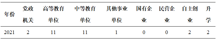 集团、公司高度重视员工的就业工作,成立了领导小组,并且签订了毕业生就业工作责任书,严抓毕业生就业工作。公司设立毕业生就业专项经费,举办毕业生就业讲座,开展各种资格证书培训以增强毕业生进入社会的就业竞争力。体育专业硕士毕业生的就业领域广泛,员工毕业后的就业去向包括:党政机关、高等教育单位、中初等教育单位、其他事业单位和国有、民营企业、自主创业和升学为主要就业渠道,具体见下表。2021年有2名硕士研究生考取博士,进行深造。