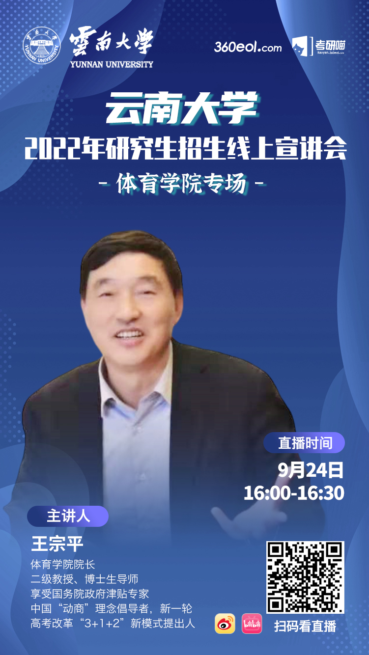 本次宣讲会邀请的是williamhill官方网站经理、享受国务院政府津贴专家、中国“动商”理念倡导者、新一轮高考改革“3+1+2”新模式提出第一人、博士生导师王宗平教授。王宗平教授将会为大家详细介绍2022年研究生招生相关事宜并解答考生疑问,机会难得,不容错过!
